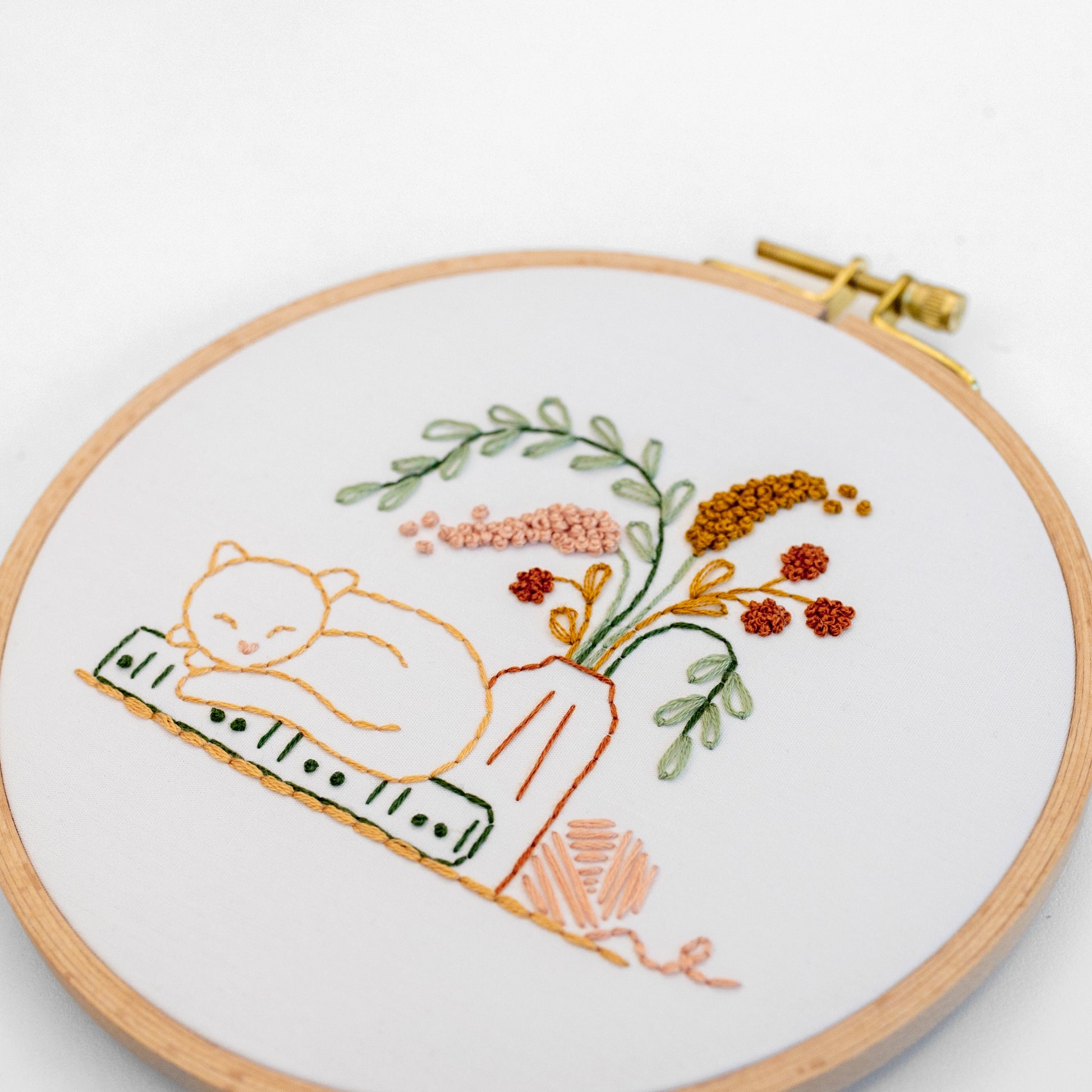 Four cat-themed beginner embroidery kits with all the supplies you need to get started with learning embroidery