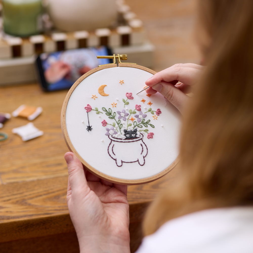 Stitch all of your faves - a cauldron, a spider and its web, and of course, a black cat poking its cute little head out! This pattern features most beginner stitch techniques, so it is the perfect place to begin your embroidery journey.