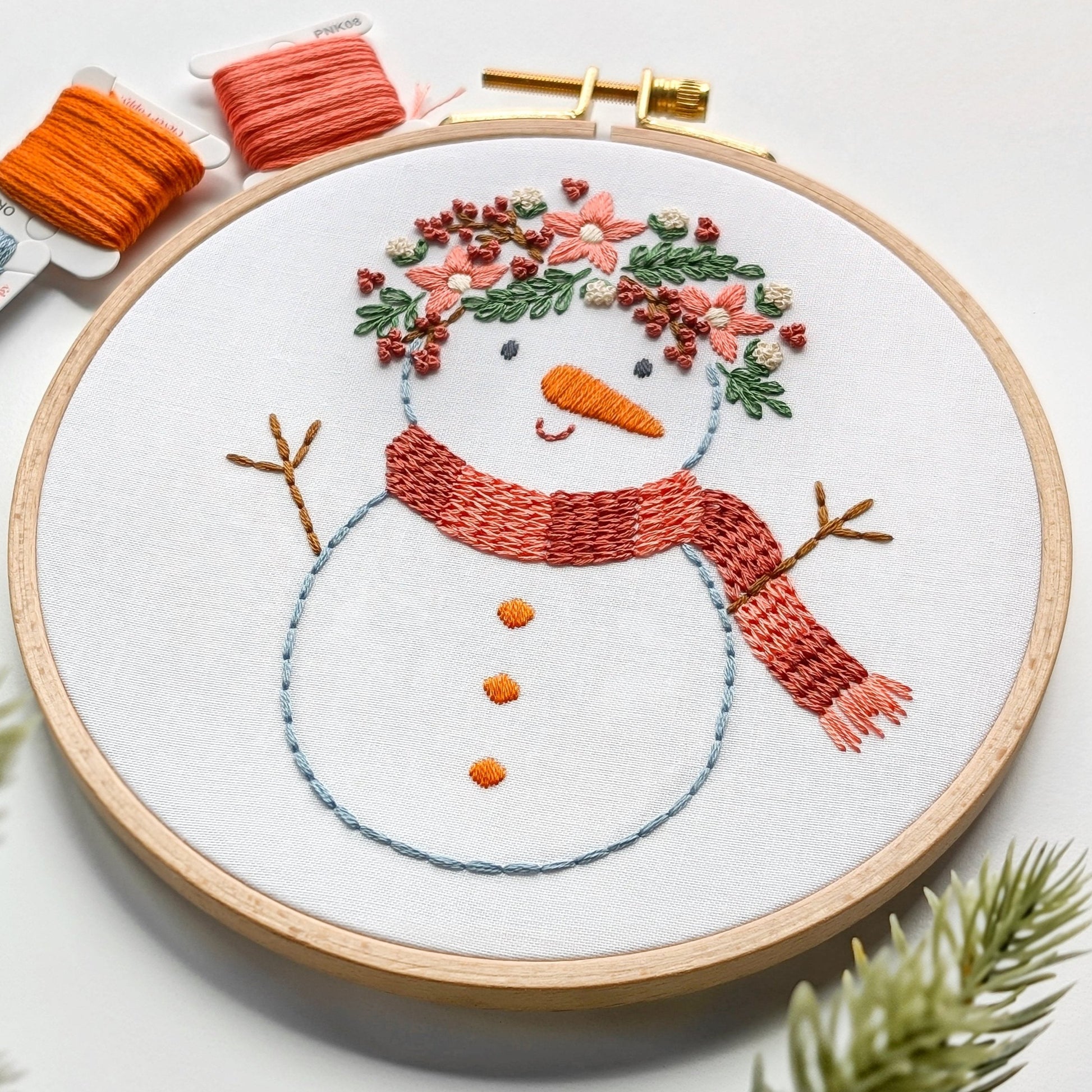 Add a touch of cuteness to your festive decor this season with our Snowman pattern! This stylish snowman features a beautiful winter-floral crown, chunky textured scarf and of course a carrot for his nose! This pattern is perfect for beginners wanting to learn embroidery.